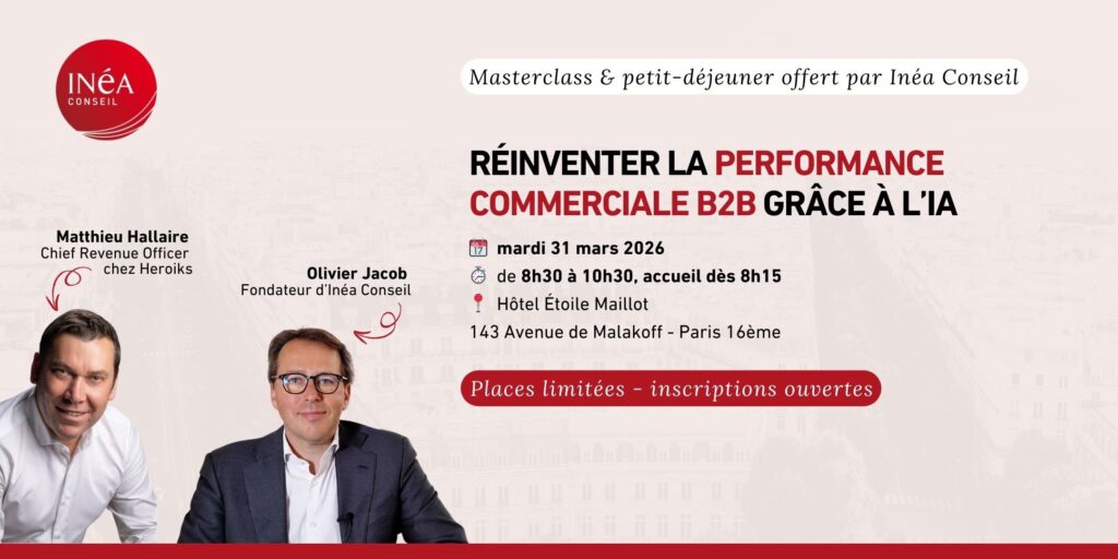 Le 31 mars 2026, de 8h30 à 10h30, Inéa Conseil organise une matinale exclusive intitulée “Réinventer la performance commerciale B2B grâce à l’IA”. Cet événement se tiendra au prestigieux hôtel Étoile Maillot, situé au 143 Avenue de Malakoff, Paris 16ème.